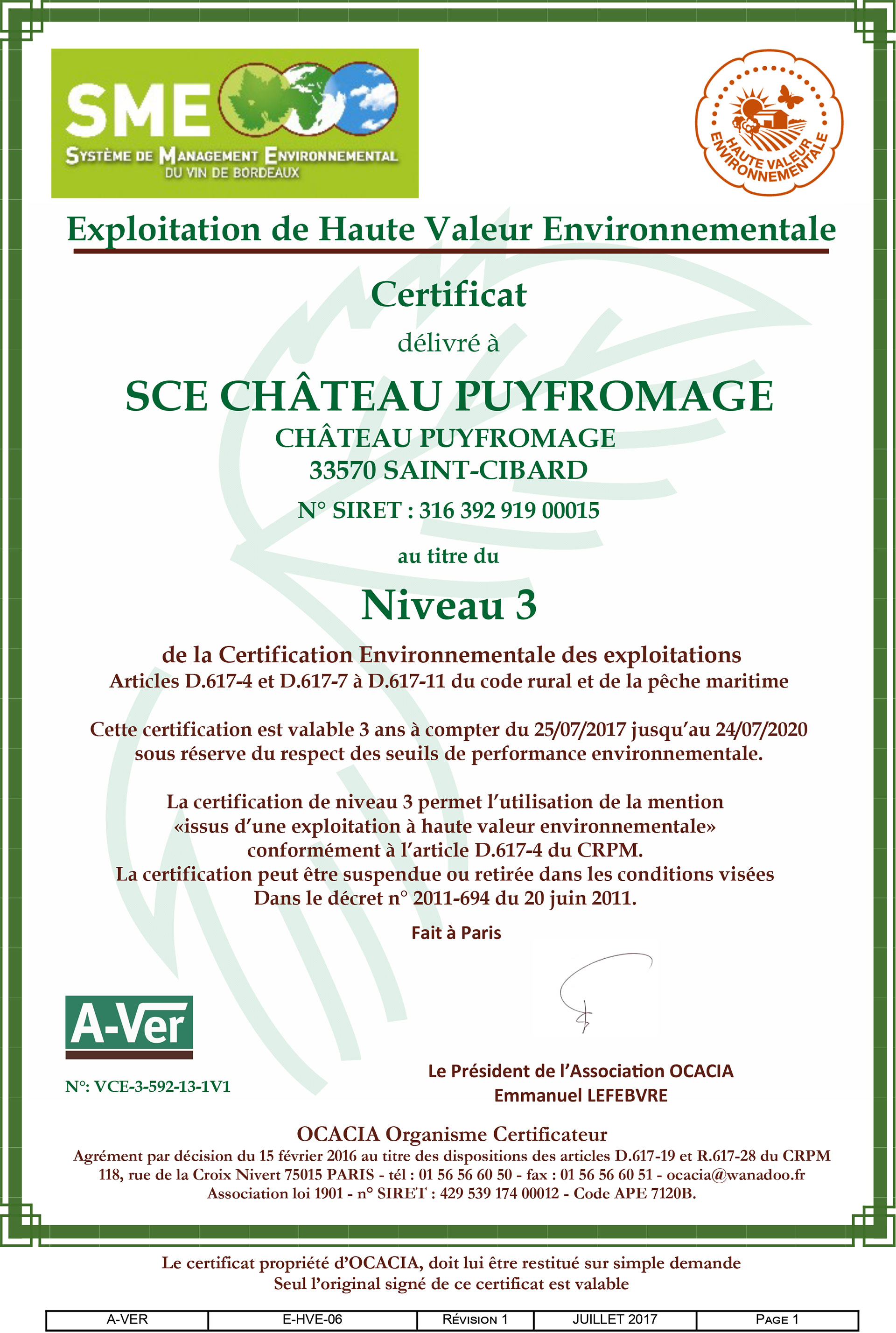 Château Puyfromage : Certifications environnementales ISO 14001 et HVE3
